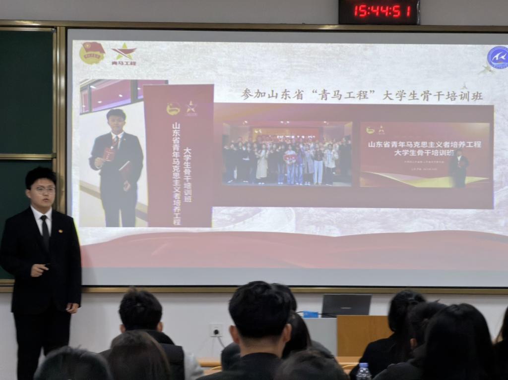 山东省“青马工程”大学生骨干培训班学员孟令启率先分享,围绕“青马工程”设立背景、“培养政治坚定、德才兼备的青年马克思主义者”核心目标及理论武装、实践锻炼等关键内容展开讲解,帮助学员构建系统性认知。